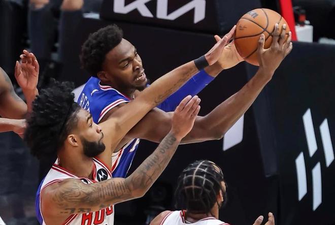 不过76人这边进攻效率丝毫不减,牢牢掌控着20来分的领先优势,半场比赛战罢,76人75-56领先公牛19分。下半场比赛开始,易边再战,布泽利斯追身三分球突施冷箭,揭开第三节比赛序幕,马克西扛着篮球面筐冲击篮下强硬得分,乌布雷45度角大号三分开火一击命中,马克西同样的位置飙射三分球正入网心。此后一段时间,76人的进攻浪潮戛然而止,公牛趁机发动反击,将分差缩小到10分左右,三节比赛打完,76人95-84领先公牛11分。末节决战,主场作战的公牛越战越勇,连续依靠冲击内线缩小分差。
