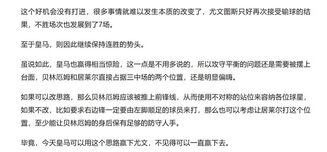 当然了,细节方面还有很多瑕疵,包括让贝林厄姆回追就不对,另外就是还不能下什么定论,毕竟谁都知道打巴萨、打国家德比和打其他比赛不同,就像马雷斯卡打巴黎圣日耳曼时类似,都知道这个时候不能再嗨了,但打其他看起来不比巴塞罗那的强队,或者自身状态有些飘忽和不足的时候,在嗨和收之间,能不能找到更精准的平衡,就是更大的学问了。