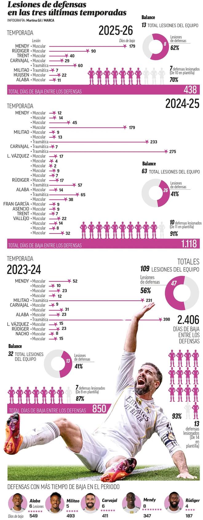 吕迪格、门迪、卡瓦哈尔、阿诺德、米利唐、赫伊森与阿拉巴等人的轮番缺席,使得教练手中的后卫可用人数减半。本赛季仅进行13场比赛,皇马10名后卫中已有7人遭遇伤病。仅阿森西奥、弗兰-加西亚与卡雷拉斯幸免于难,其余球员均已出现过不同程度的伤病情况。