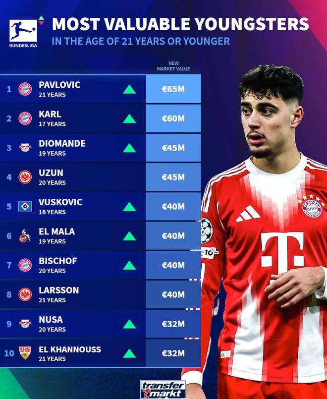 北京时间12月19日,在更新了德甲球员的身价之后,德转列出了此次更新后德甲身价最高的10名U21球员,亚历山大-帕夫洛维奇6500万欧元第一,伦纳特-卡尔6000万欧元第二,比朔夫4000万欧元上榜。